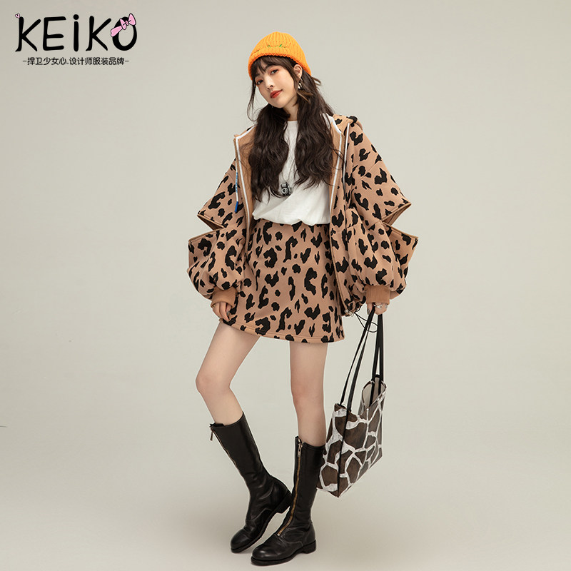 时髦豹纹春季休闲套装女2021新款设计感卫衣外套+a字半身裙两件套热门设计联盟服务商