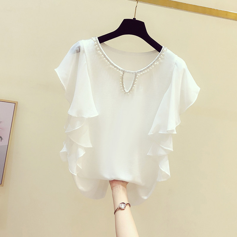 钉珠雪纺拼接荷叶边袖圆领T恤女短袖2021夏季新款设计感甜美上衣热门设计联盟服务商